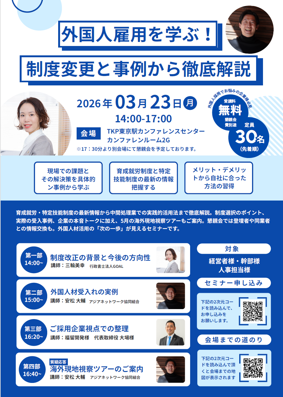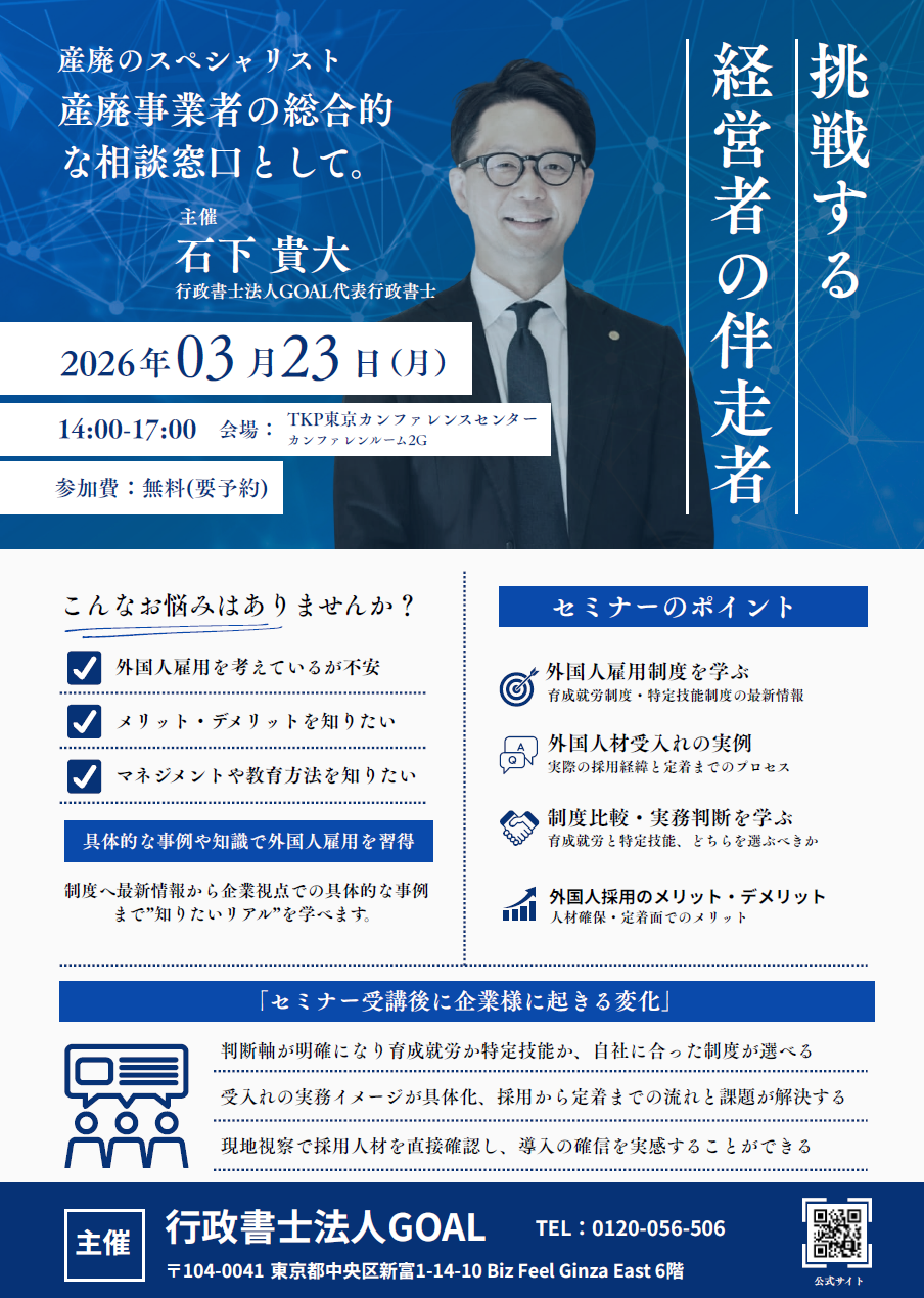 行政書士法人GOALでは、このほど以下の日程で標題のセミナーを開催することとなりました。育成就労・特定技能制度の最新情報から中間処理業での実践的活用法まで徹底解説。制度選択のポイント、実際の受入事例、企業の本音トークに加え、5月の海外現地視察ツアーもご案内。懇親会では登壇者や同業者との情報交換も。外国人材活用の「次の一歩」が見えるセミナーとなっております。先着30名様となっており、現在お席がうまってきておりますのでお早めにお申し込みくださいませ。